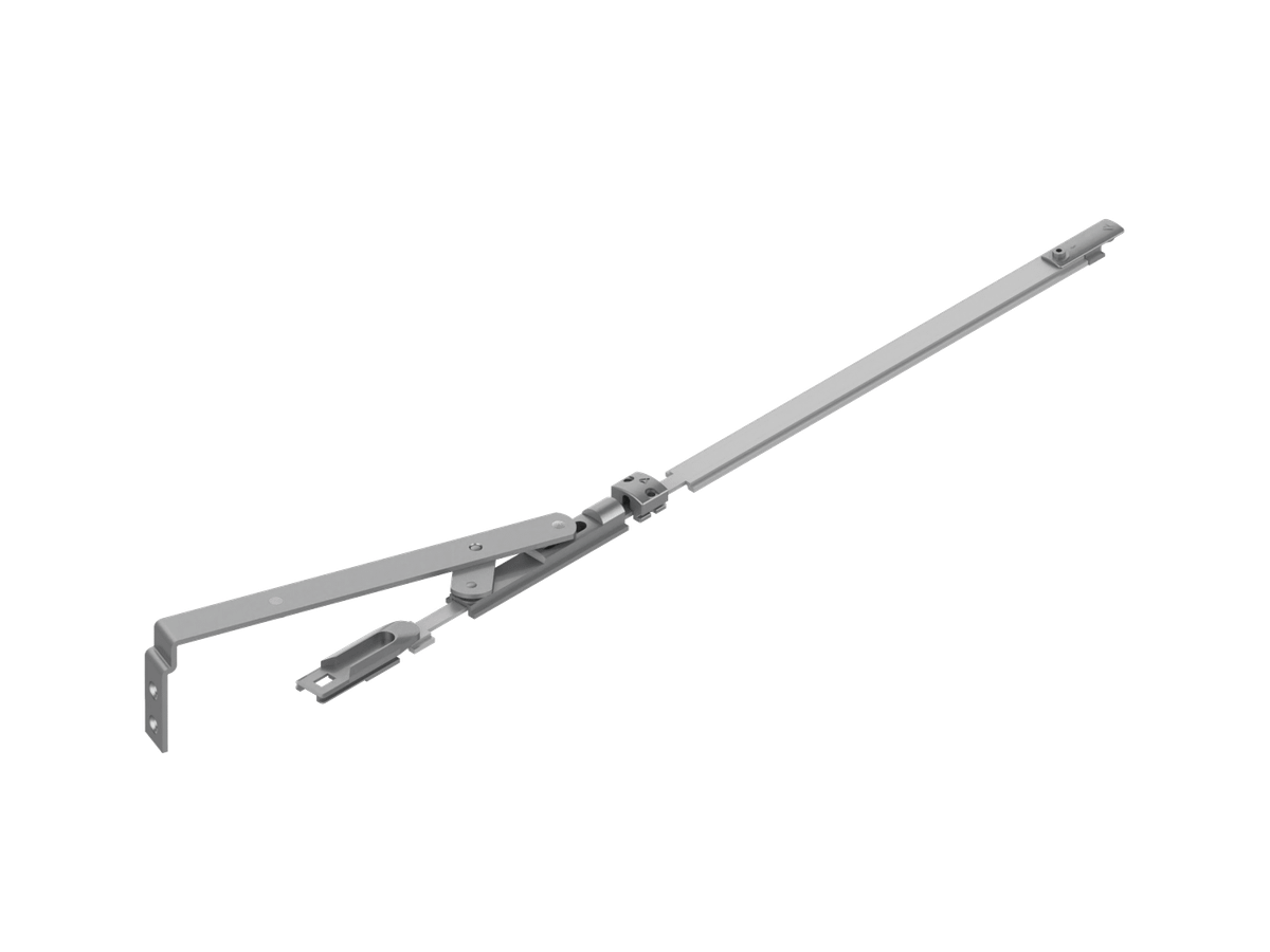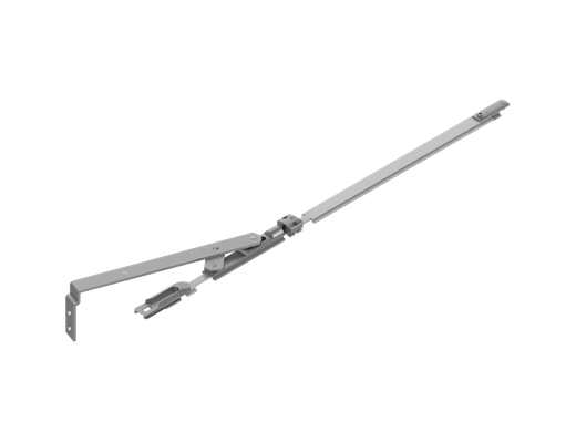 Compás limitador/guía para hojas oscilobatientes, versión pequeña, compatible con el sistema Oscilobatiente 700 de ALMA, diseñado para hojas de 38 a 55 mm de ancho. Funciona como herraje mecánico lateral, oculto cuando la ventana está cerrada y visible sólo al abrirse.